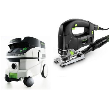 With a full 720 watts, this is one of the most powerful jigsaws around. It will cut 4 3/4" wooden beams, 3/4" aluminum or 3/8" steel with ease! Electronic Multi-Material Speed Control gives you the correct constant speed for the material youre sawing - prevents overheating and keeps the saw running smoothly. Patented triple blade guidance with parallel adjustable carbide guides that counteract the lateral pressure on the blade so that the Trion makes straight perpendicular cuts every time. Can set a bevel to 45 degrees on either side, and can even start cuts in wood without a pilot hole. 6 Amp motor, 1" stroke, 1,000-9,000 spm, 4 stage stroke adjustment. Jigsaw includes: blade, splinter guard, chip deflector and T-LOC Systainer #1 storage container. The new CT26 incorporates increased capacity, innovation and versatility into this new design. With the dual mode power activation, the user chooses either a tool activated or manual activated start-up. This CT (Cleantec) unit is extremely mobile, with a sturdy chassis, extra large low abrasion rear tires, and double swivel casters up front to easily negotiate any obstacle. The CT26 dust extractor can be secured in place with a single point foot brake. The filter bags have even been redesigned to be self cleaning. These bags inflate and deflate with the cycling of the unit for maximum suction force and efficiency. An integrated hose garage has been added for easy hose storage. As with all Festool dust extractors, the CT26 utilizes the Sys-Dock system that facilitates the use/storage of one or more Systainers to the top of the unit.. Will work wet or dry with no complex conversion, and is remarkably quiet. Includes: CT 26 E - 6.9 Gallon HEPA Mobile Dust Extractor, HEPA Filter, (1) Fitted Filter Bag, and (1) 1 1/16" x 11.5 Antistatic Suction Hose.Read more Festool PSB 300 EQ Jigsaw with T-LOC + CT 26 Dust Extractor Package